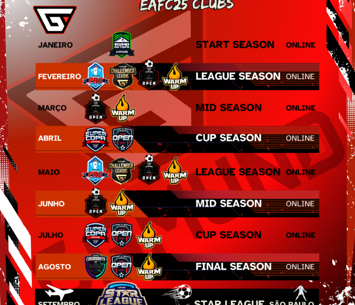 ______________________ JANEIRO [ START ] 1º. RUMO A GAMUND PRO LEAGUE Aqui será onde começa a sua história dentro do competitivo GAMUND apartir do dia 20/01/2025. Você irá disputar neste torneio RUMO AO TOPO… 12 vagas para a GAMUND PRO.